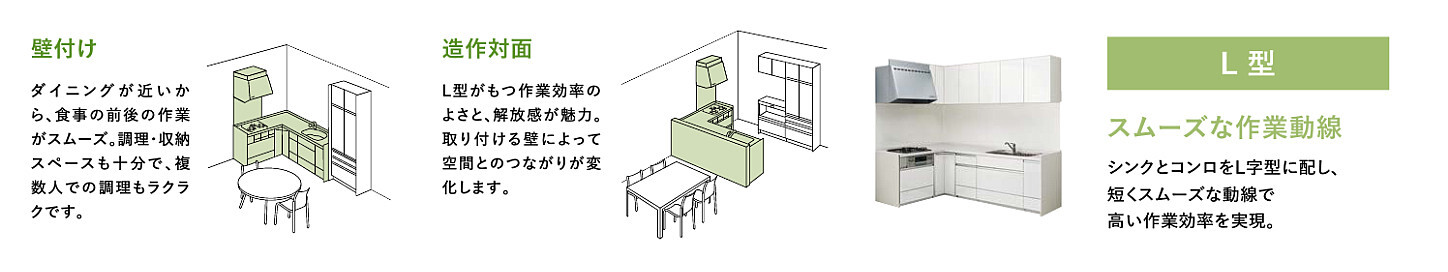 L型キッチン: シンクとコンロが90度の角度で配置されるレイアウト。作業スペースが広く、複数人での調理がしやすいです。